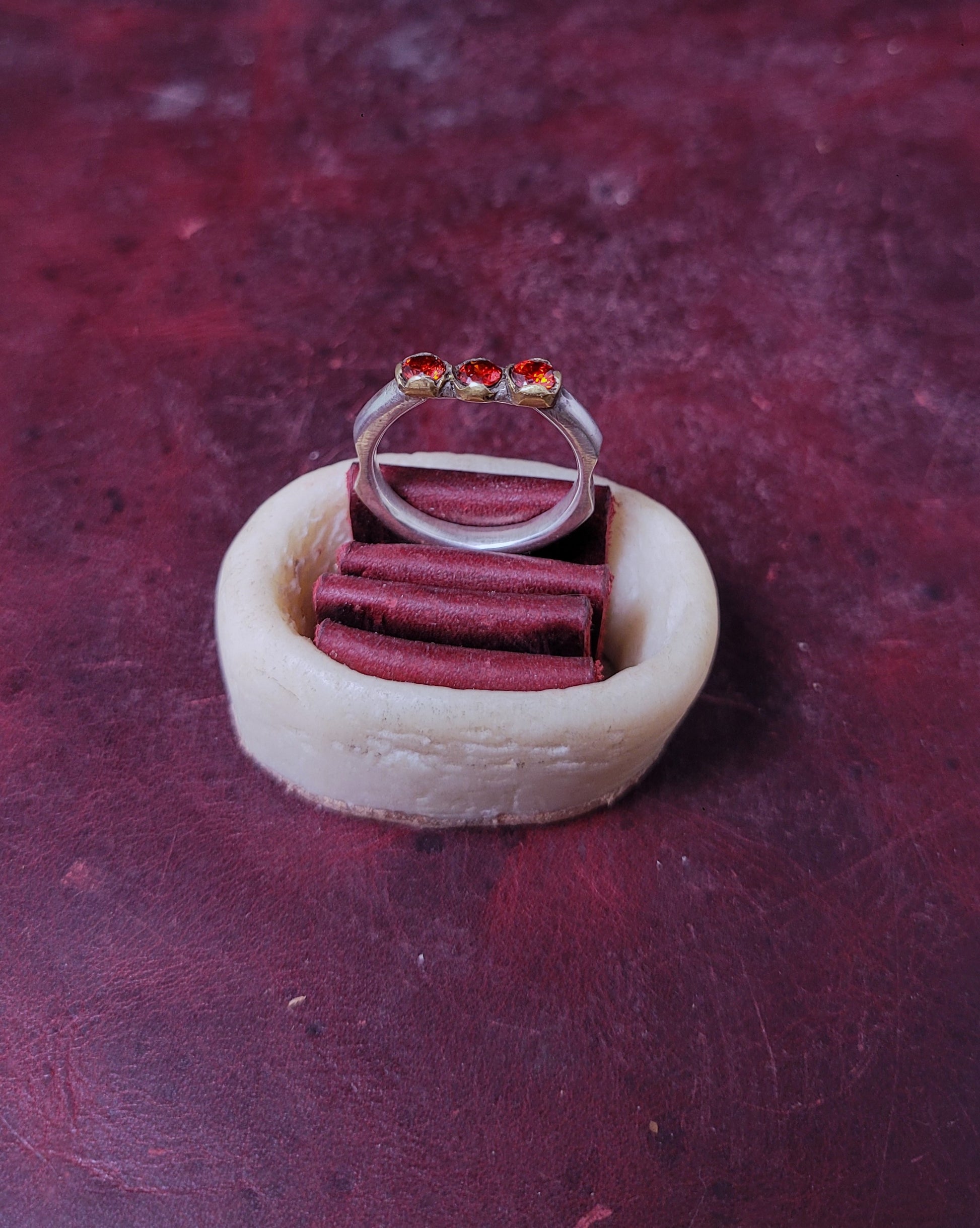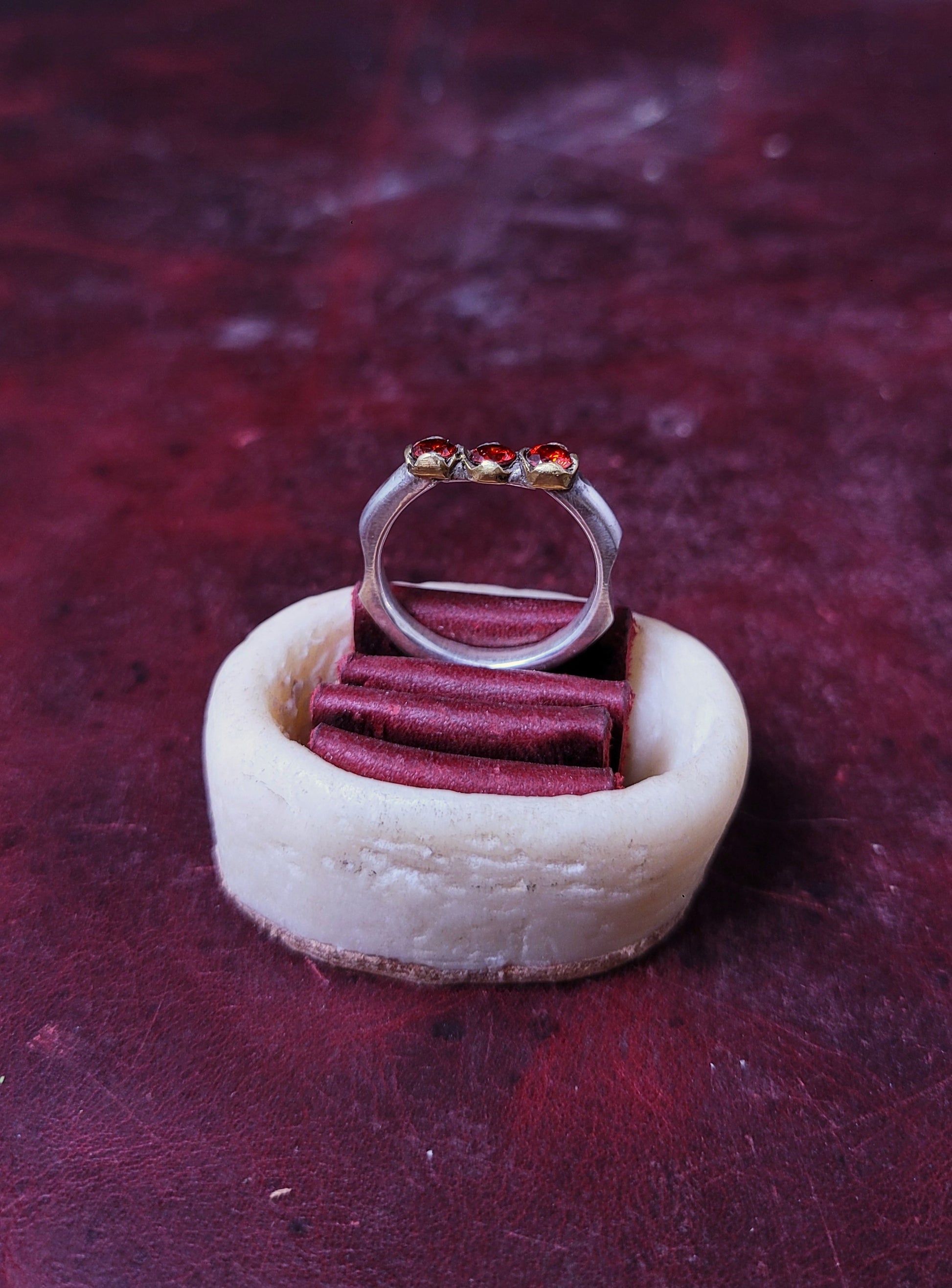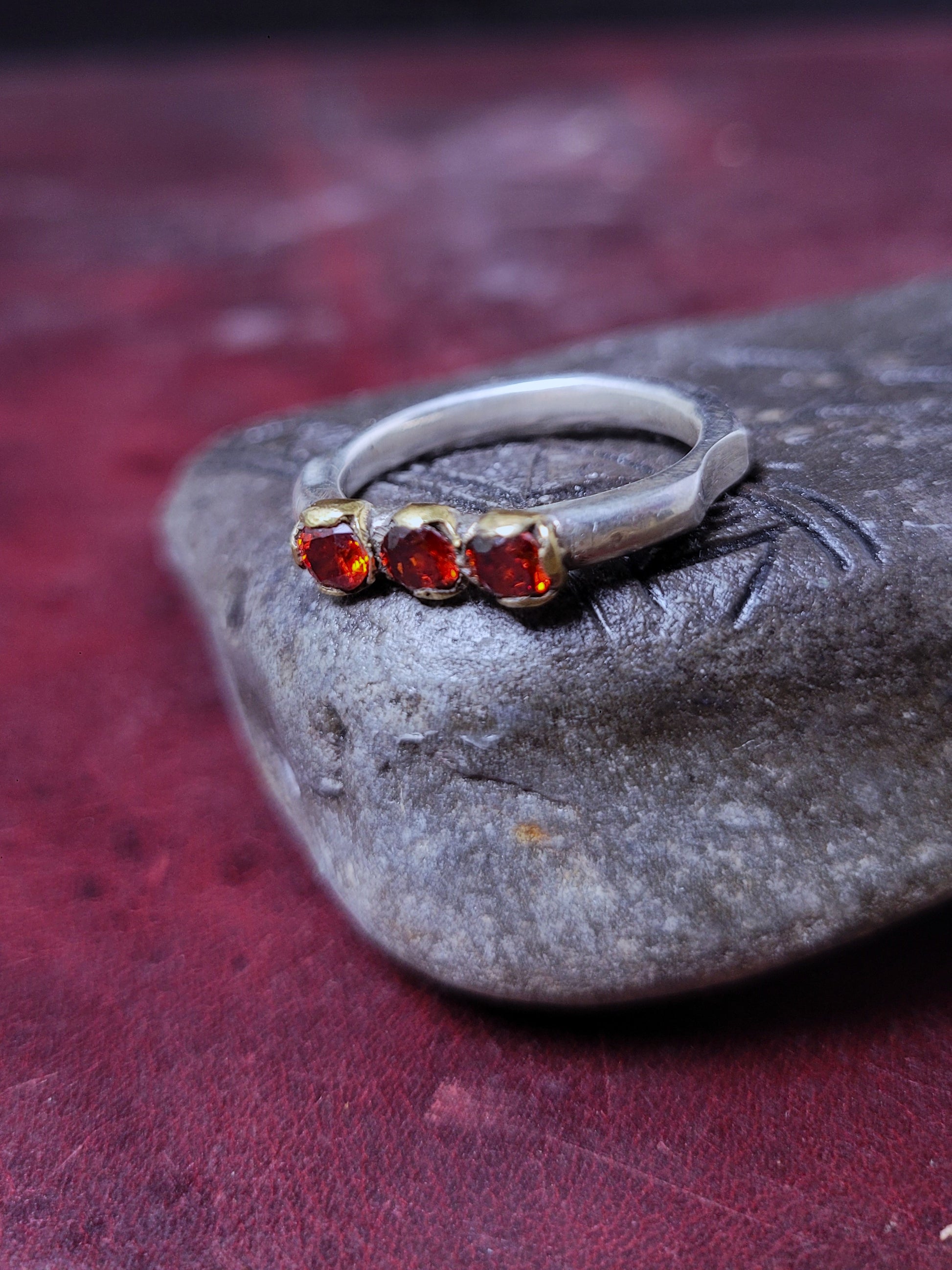 Step back in time with this stunning .925 silver medieval ring, adorned with a faceted band and three fiery 4mm red CZ stones. The perfect touch of ancient elegance, this ring is inspired by the beautiful elegance of the simple nun and their love for the medieval Catholic church. Perhaps, a Viking raider fond it and brought it home to his maiden long ago? Don't miss the chance to add this exquisite piece to your collection today!