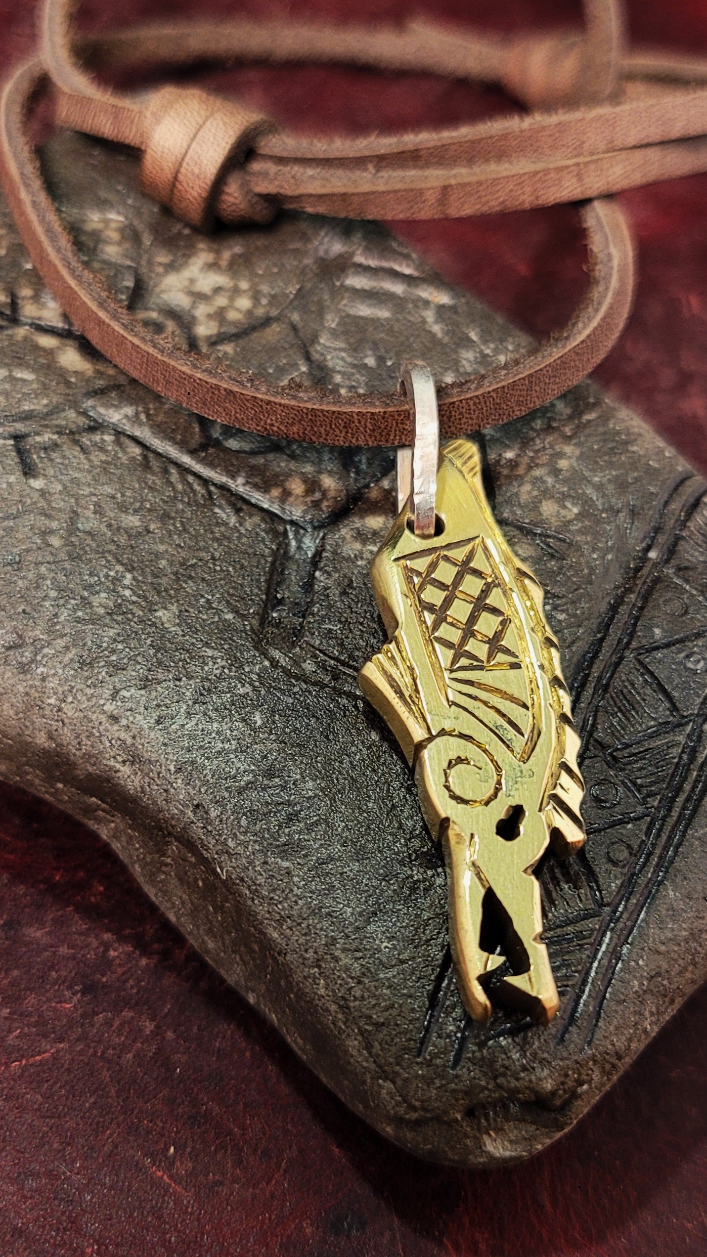 Unleash the strength of the fearsome sea serpent with this meticulously crafted brass pendant, adorned with a two-sided intricately carved design and a .925 silver hanging ring. The adjustable leather cord adds a touch of versatility to this powerful accessory. Hiding in the depths of the ocean, this mythical creature has been revered and feared by sailors from all corners of the world. Let the sea dragon protect and guide you on your voyages, near or far, by wearing this pendant as a symbol of its mighty influence.
