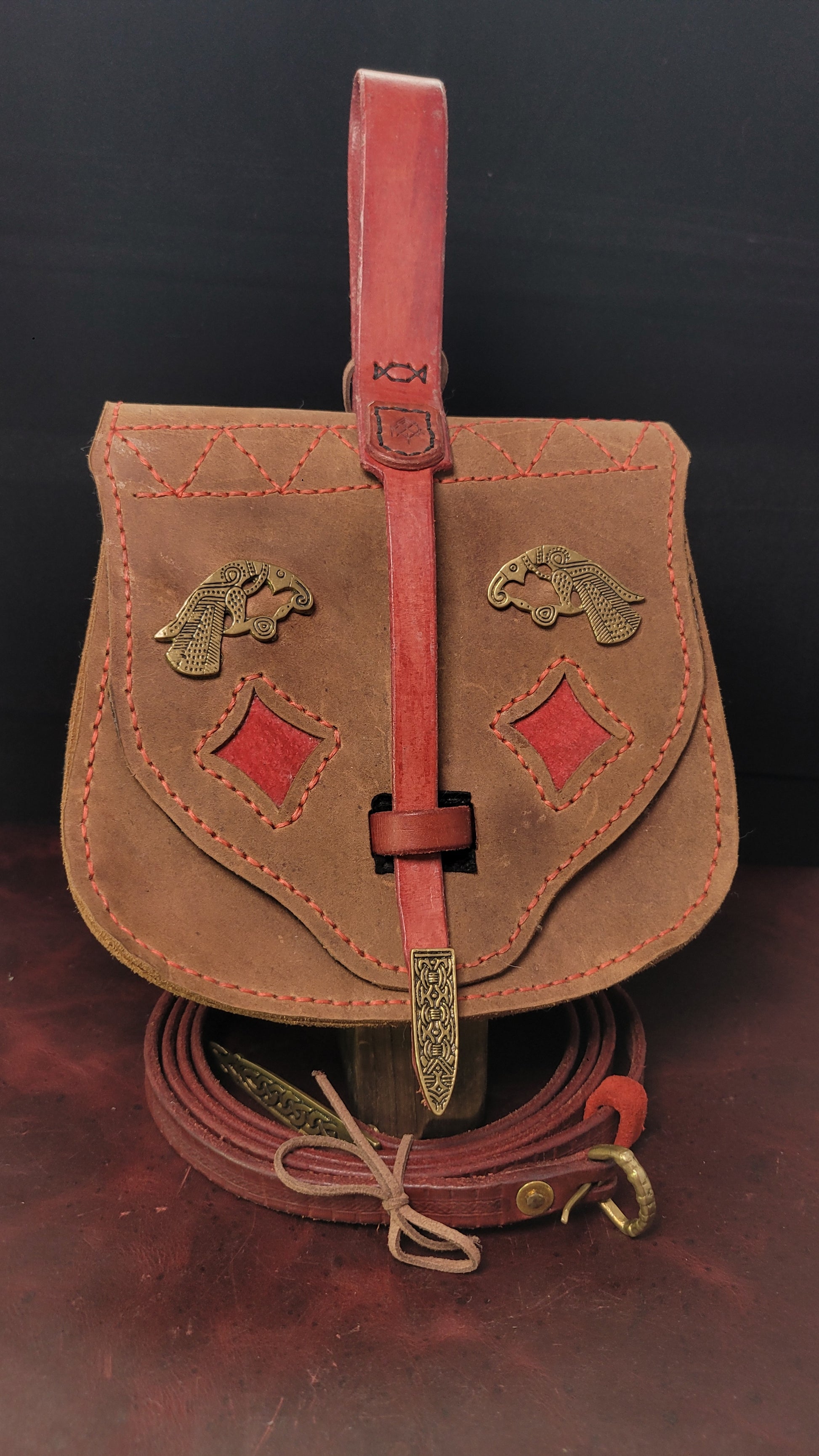 Experience the luxury of our leather pouch, inspired by the timeless Birka style. Adorned with two exquisite brass ravens, this pouch is crafted using the traditional lost wax/sand casting technique. Its sleek design is complemented by a plush black suede lining, while the included long belt allows for versatile wear - around the waist or over the shoulder. Measuring 6" wide, 6.5" tall, and 1.75" deep, this pouch is the perfect accessory for any outfit.