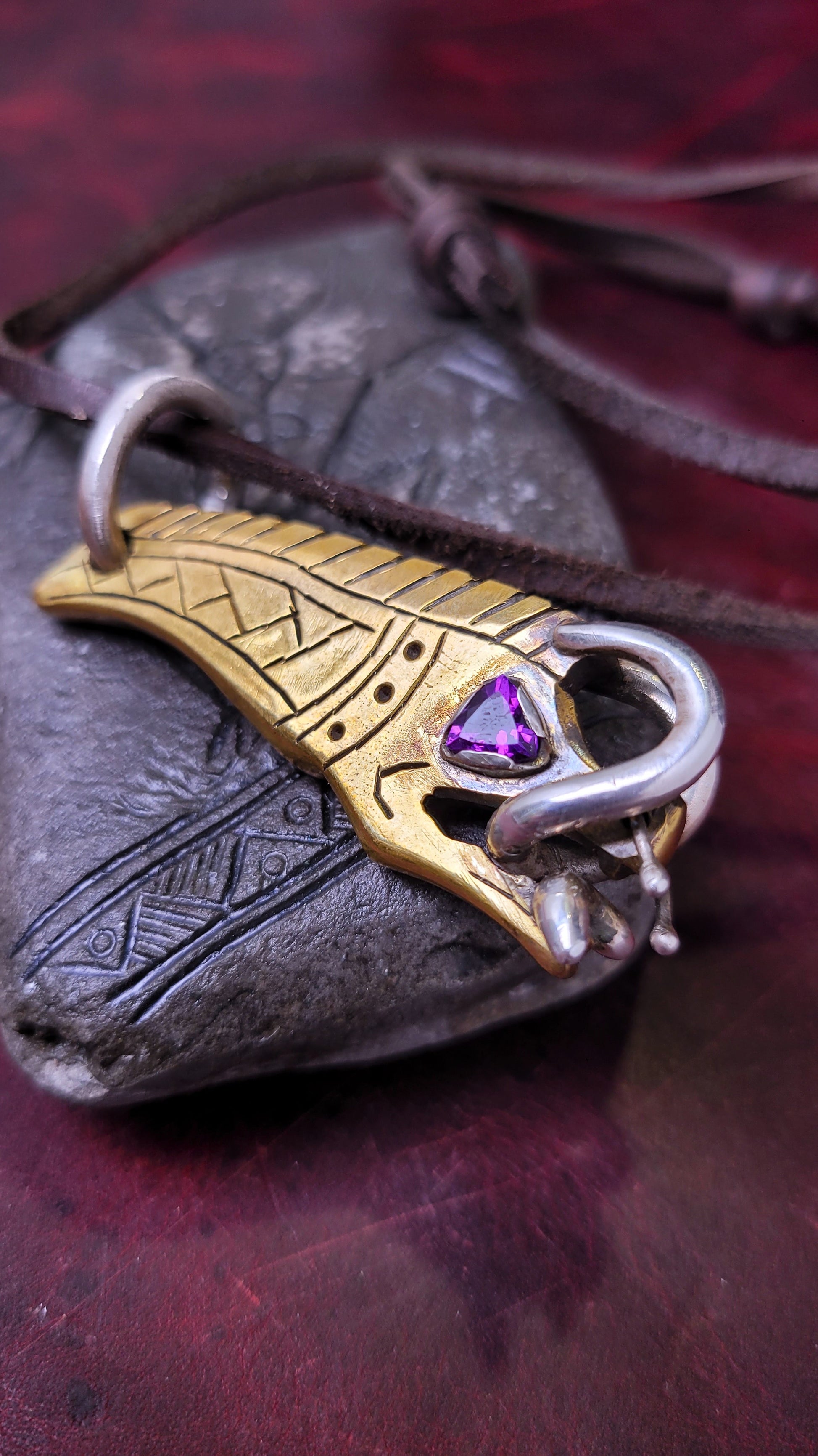 Experience the exquisite craftsmanship of our handcrafted brass pendant featuring a majestic wild boar with meticulously hand-chiseled details. The boar's large tusks and free-moving nose ring, both made of .925 silver, add a touch of elegance. The eye is adorned with a stunning 8x8 mm trillion cut Royal Amethyst stone, while the pendant hangs gracefully on an adjustable leather cord.