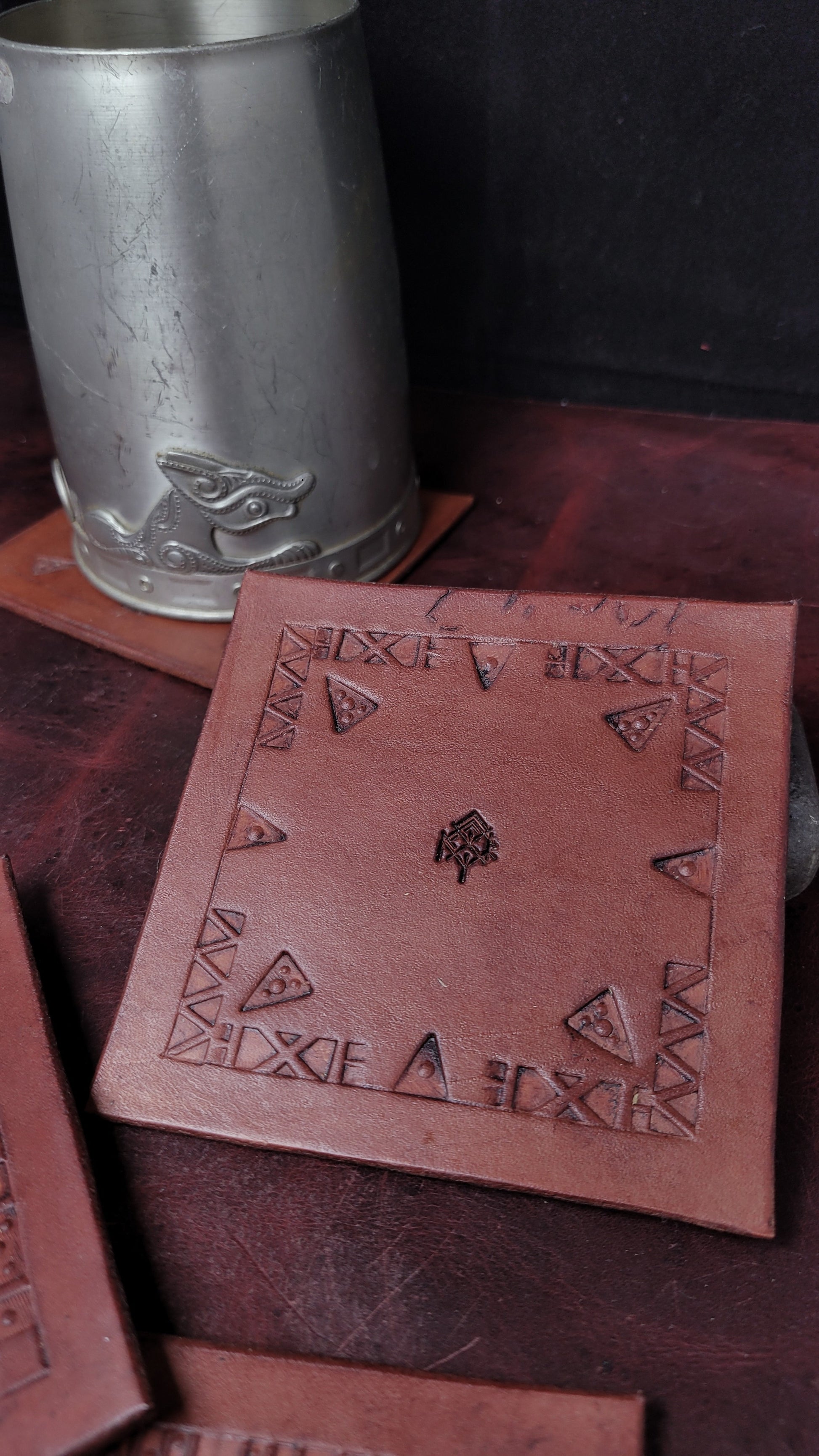 Experience the craftsmanship and artistry of our veg-tan leather coasters. Each one is hand-stamped with a unique Norse era motif, making each coaster one-of-a-kind. Embrace the natural variations and appreciate the attention to detail in these custom-made pieces.