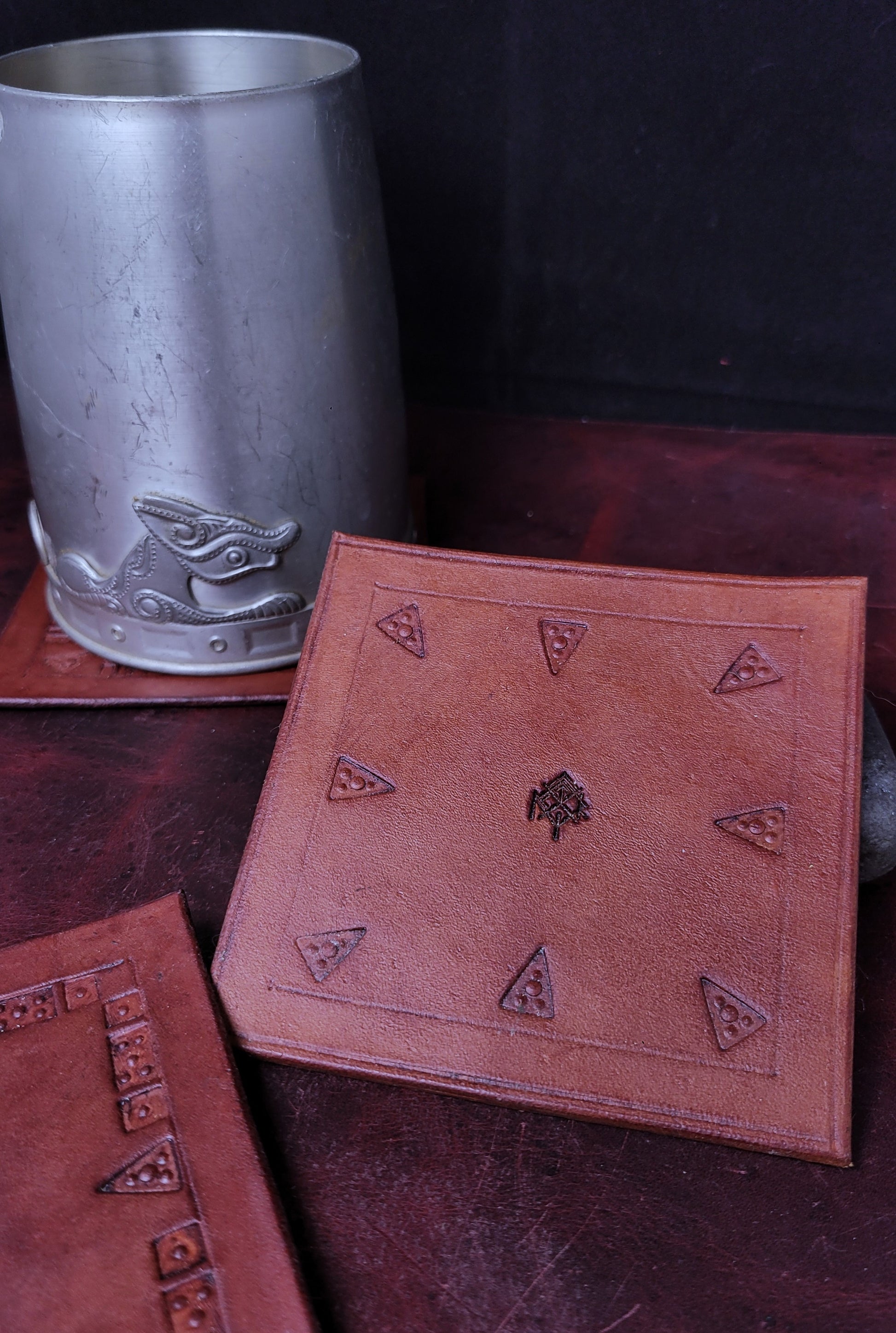 Experience the craftsmanship and artistry of our veg-tan leather coasters. Each one is hand-stamped with a unique Norse era motif, making each coaster one-of-a-kind. Embrace the natural variations and appreciate the attention to detail in these custom-made pieces.